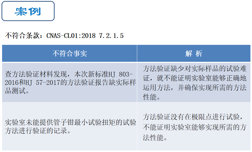 這2個不符合都是在進行試驗驗證時,在個別方面偏離了方法標準的要求。嚴格意義上說這不算是對標準方法的驗證,如果實驗室打算長期偏離標準方法操作,應按非標申請認可,并做方法確認。準則的7.2.2.1規(guī)定,對修改的標準方法要進行確認。對標準方法的驗證不應該有偏離標準要求的情況出現。